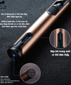 Thân bật lửa làm từ hợp kim cao cấp, được xử lý sơn tĩnh điện với màu đồng ánh kim kết hợp chi tiết viền đen, tạo nên một tổng thể hiện đại, nam tính và nổi bật trên mọi nền màu. Các chi tiết như nút trượt lửa, van điều chỉnh và nắp bơm gas đều được hoàn thiện chỉn chu, mang lại cảm giác cao cấp ngay từ lần chạm đầu tiên.
