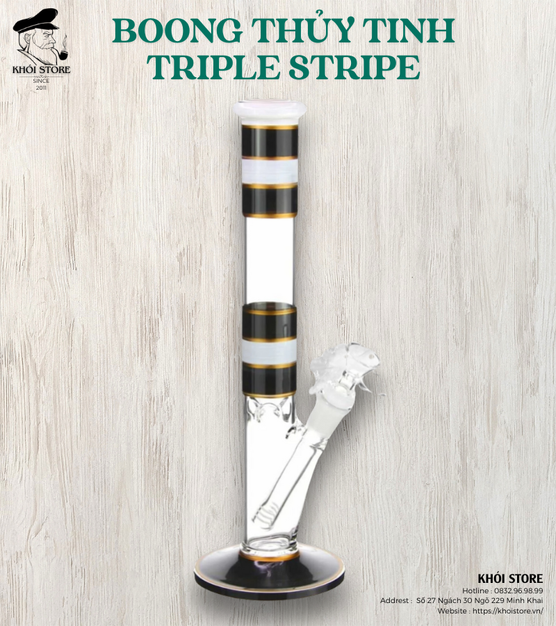 Với chiều cao trung bình (khoảng 30–35 cm tùy phiên bản), Boong Thủy Tinh Triple Stripe không quá cồng kềnh khi sử dụng mà vẫn đủ dài để tạo hiệu ứng lọc và làm mát tốt. Phần đế rộng giúp boong đứng vững, giảm thiểu nguy cơ đổ ngã trong quá trình sử dụng.