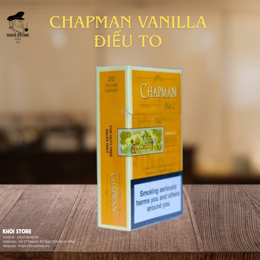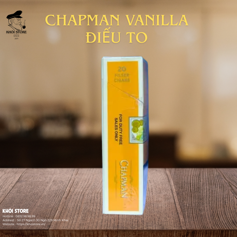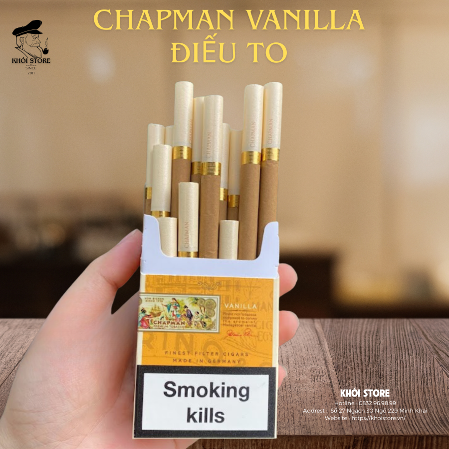 Chapman Vanilla No.2 ( Điếu To ) là một trong những dòng cigar mini filter cao cấp đến từ Đức, nổi bật với hương vanilla quyến rũ, nhẹ nhàng nhưng vẫn giữ được sự đậm đà vốn có của lá thuốc tẩu tự nhiên. Được sản xuất bởi thương hiệu Chapman – một trong những cái tên lâu đời và uy tín trong ngành cigar, dòng sản phẩm này nhanh chóng trở thành lựa chọn yêu thích của những tín đồ yêu thích sự kết hợp giữa đẳng cấp – mùi hương sang trọng – và sự tiện lợi.