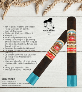 Cigar EP Carrillo La Historia El Senador là dòng cigar cao cấp thuộc bộ sưu tập “La Historia” từ thương hiệu EP Carrillo, vốn nổi tiếng với sự tỉ mỉ và tay nghề thủ công đỉnh cao. Đây là sản phẩm dành cho những người sành cigar, yêu cầu sự hoàn hảo từ hương vị đến chất lượng.