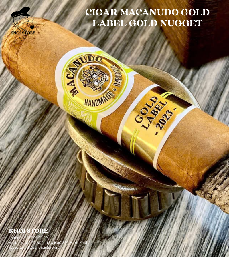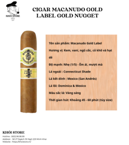 Nếu như Cohiba đại diện cho sự mạnh mẽ, quyền uy thì Cigar Macanudo Gold Label Gold Nugget lại là biểu tượng của sự thanh tao, dịu ngọt và đầy tinh tế. Đây là dòng sản phẩm giới hạn (Limited Edition) được săn đón gắt gao mỗi năm, nổi tiếng với việc sử dụng những lá Wrapper “vàng” quý hiếm.