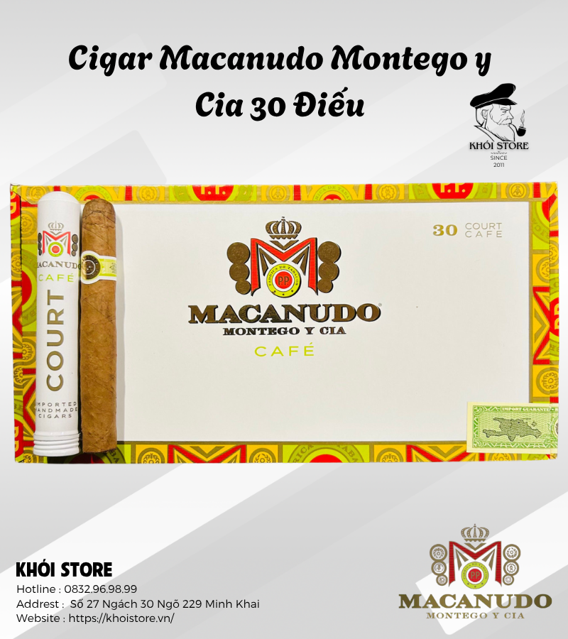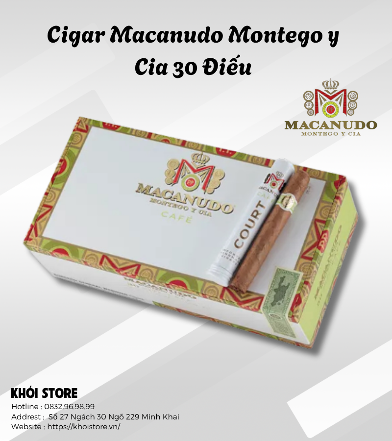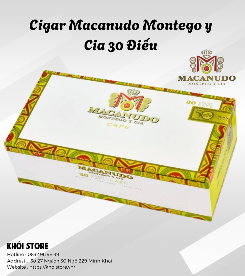 - Quà tặng sang trọng: Hộp 30 điếu với thiết kế màu vàng và xanh lá cây nổi bật, in logo Macanudo Montego y Cia tinh tế, là món quà tặng ý nghĩa, đẳng cấp cho đối tác, bạn bè, hoặc người thân.