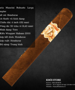 Đến từ một trong những thương hiệu cao cấp lâu đời và đáng tin cậy nhất của chúng tôi, xì gà Maria Mancini Robusto Larga đã làm hài lòng khẩu vị tinh tế của những khách hàng JR trung thành của chúng tôi trong hơn 30 năm. Được trình bày theo dạng hộp ép, để dễ dàng hút, Robusto Larga 6 x 50 có lớp vỏ Haba na 2000 màu nâu đỏ sẫm tuyệt đẹp và lớp lõi dài Nicaragua được ủ hoàn hảo, được giữ lại với nhau bằng chất kết dính Honduras ngon miệng. Robusto Larga có hương vị trung bình đến đậm đà, là loại khói lâu dài với hương vị quyến rũ của đất, gỗ, da, hạt tiêu và cà phê rang đậm. Đặt mua ngay gói 10 điếu siêu phải chăng từ JR Cigar ngay hôm nay và khám phá một trong những thương hiệu hàng đầu của Honduras đã giúp đưa JR Cigar lên tầm cao mới.
