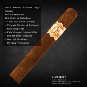 Hãy giới thiệu cho người mua sắm của bạn về Maria Mancini Robusto Larga Sampler… một trong những thương hiệu lâu đời và đáng tin cậy nhất của Honduras trên thị trường hiện nay. Được giới thiệu với hai loại lá bọc riêng biệt và đậm đà, Maria Mancini được bọc tự nhiên sử dụng lá bọc Habana 2000 màu nâu đỏ sẫm để mang đến hương vị đậm đà từ trung bình đến đầy đặn của gia vị, đất, da thuộc và cà phê.