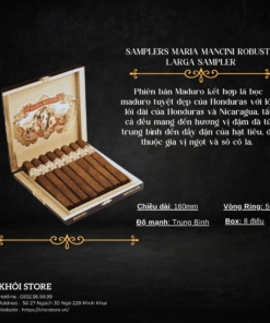Phiên bản Maduro kết hợp lá bọc maduro tuyệt đẹp của Honduras với lớp lõi dài của Honduras và Nicaragua, tất cả đều mang đến hương vị đậm đà từ trung bình đến đầy đặn của hạt tiêu, da thuộc gia vị ngọt và sô cô la. Cả hai loại tuyệt đẹp được đóng hộp theo phong cách Cuba được đánh giá cao này sẽ trở thành lựa chọn hàng đầu trong số những người hút thuốc yêu cầu một điếu xì gà cao cấp với cấu trúc hoàn hảo, hương vị đậm đà và giá cả rất phải chăng. Hãy đặt mua Maria Mancini Robusto Larga Sampler từ nơi duy nhất bạn có thể tìm thấy — ngay tại Santa Clara Cigars.