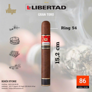 Villiger La Libertad Robusto là dòng xì gà trung bình với thiết kế Robusto cổ điển được sản xuất tại nhà máy Villiger de Nicaragua với xuất xứ từ Nicaragua. Xì gà có kích thước chiều dài 5 inches và vòng ring 52 xuất xứ từ Nicaragua, mang đến hương vị đặc trưng từ lá ngoài Nicaraguan Criollo, lá binder từ thung lũng Cibao tại Dominican và lá ruột gồm Jalapa Seco, Esteli Viso và Ligero. Với các hương vị vani, bánh quy graham, sô cô la nhẹ, quế và rượu mùi anh đào, La Libertad Robusto mang đến trải nghiệm thú vị trong khoảng 40 – 60 phút hút.