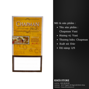 Thuốc lá Chapman Vani No.2 mang hương vị vani dịu ngọt, nhẹ nhàng, tạo cảm giác dễ chịu và thư giãn. Điếu thuốc có thiết kế mảnh mai (slim) với lớp ngoài màu nâu nhã nhặn và điểm nhấn màu vàng kim, thể hiện phong cách tinh tế và sang trọng. Được làm từ lá thuốc Virginia và Burley chọn lọc, dòng Chapman này có hàm lượng nicotine thấp, giúp mang lại trải nghiệm êm ái mà không gây hôi miệng.