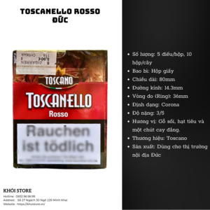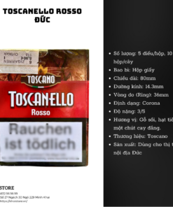 Đây là dòng xì gà ngắn (short cigar) của Đức, mang hương vị mạnh mẽ và đầy đặn. Toscanello Rosso nổi tiếng với sự cân bằng giữa hương thơm của thuốc lá và vị ngọt tự nhiên của rượu vang, tạo nên trải nghiệm hút xì gà vừa cổ điển vừa mới lạ.