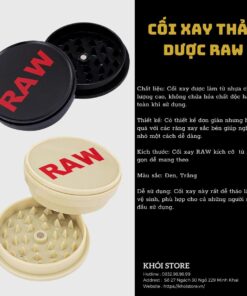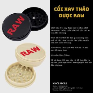 Thiết kế: Cối xay RAW có thiết kế nhiều ngăn, bao gồm ngăn xay và ngăn chứa để giữ lại phần thuốc sau khi xay xong. Kích thước nhỏ gọn, dễ mang theo bên người.