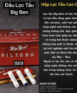 Lọc tẩu Big-Ben cỡ lớn 9mm có hai đầu dùng gốm không độc ceramic, một loại gốm công nghệ mới không cản trở luồng không khí. Bọc giữa là than hoạt tính giúp lọc độc tố có trong hơi thuốc nhưng không làm mất vị thuốc, đem lại trải nghiệm một làn khói mát, khô và thơm khi dùng lọc Big – Ben.