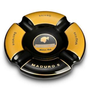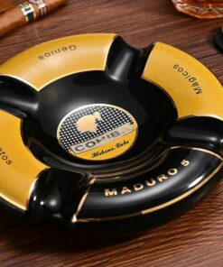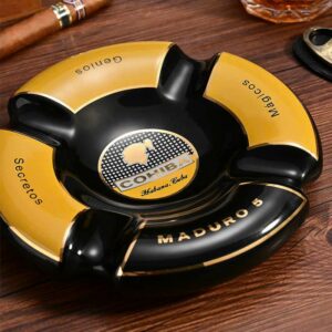 Thiết kế sang trọng: Gạt tàn Cohiba Maduro với màu sắc chủ đạo là đen và vàng, mang lại vẻ đẹp đẳng cấp, phù hợp với phong cách của những người yêu thích sự tinh tế và chuyên nghiệp.