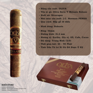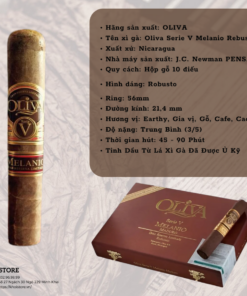 Oliva Serie V Melanio là dòng xì gà cao cấp của thương hiệu Oliva, với thiết kế tinh tế và hương vị đậm đà. Dòng Robusto, với kích thước tiêu chuẩn 5×52 (5 inch chiều dài và vòng ring 52), là một lựa chọn hoàn hảo cho những người yêu thích sự cân bằng giữa thời gian thưởng thức và trải nghiệm hương vị.