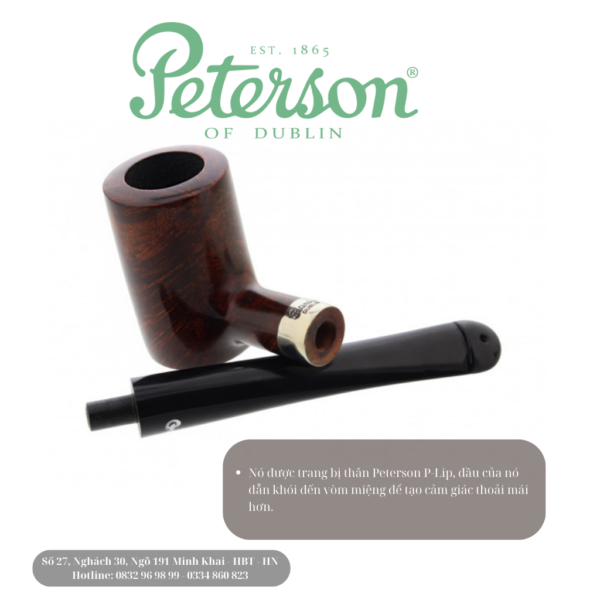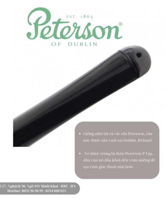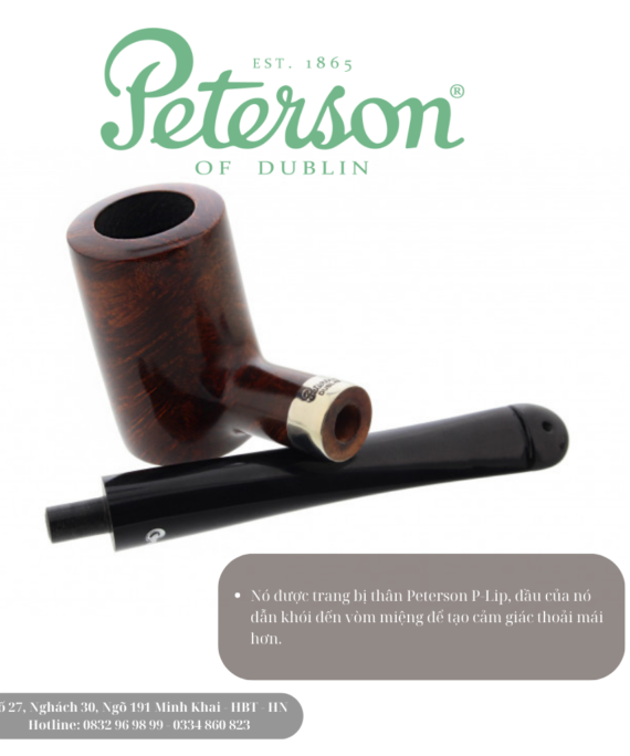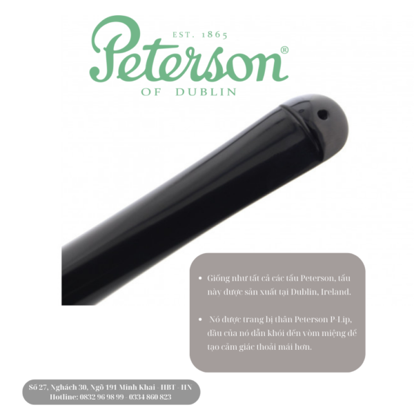 Cối tẩu của nó nhỏ hơn một chút so với các loại tẩu khác của Peterson và thân của nó được gia cố bằng một dải, khiến nó thậm chí còn có khả năng chống chịu cao hơn khi bạn tháo thân. Nó được trang bị thân Peterson P-Lip, đầu của nó dẫn khói đến vòm miệng để tạo cảm giác thoải mái hơn.