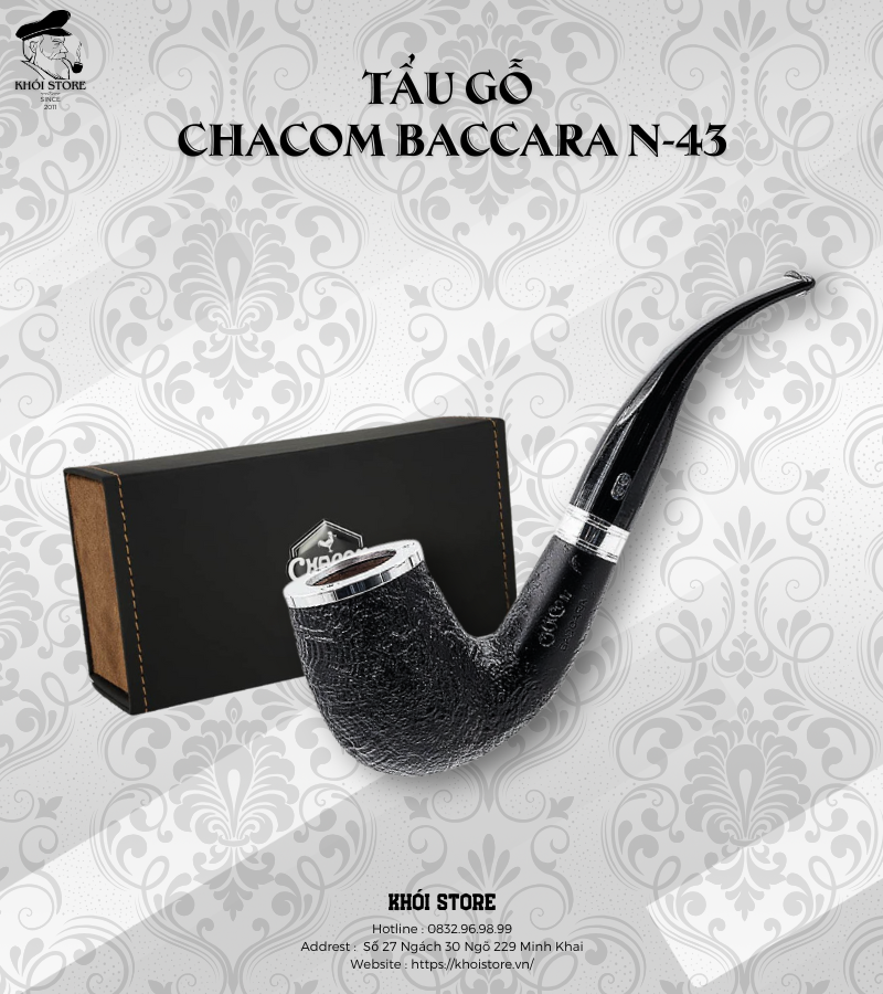 Gỗ: Tẩu Chacom Baccara N-43 chủ yếu được làm từ gỗ briar, là loại gỗ có độ bền cao và khả năng giữ nhiệt tốt. Gỗ briar thường có vân gỗ đẹp và độ cứng lý tưởng cho việc chế tạo tẩu.