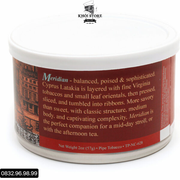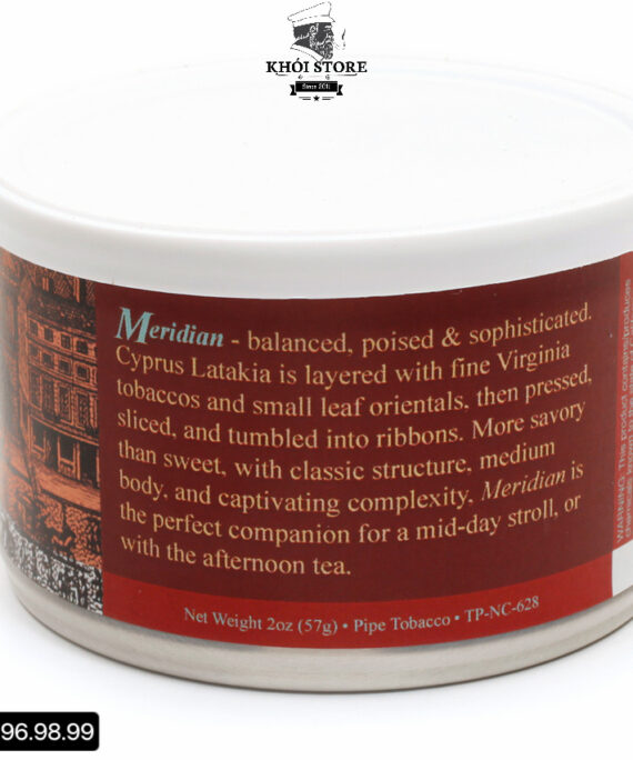 Mùi thơm: Mùi thơm của Meridian là sự hòa quyện của hương khói Latakia và các nốt hương tinh tế từ Oriental và Virginia. Mùi thơm này thường được đánh giá là dễ chịu, quyến rũ và không quá nặng nề, phù hợp cho những ai yêu thích sự phức tạp trong mùi thơm của thuốc tẩu.