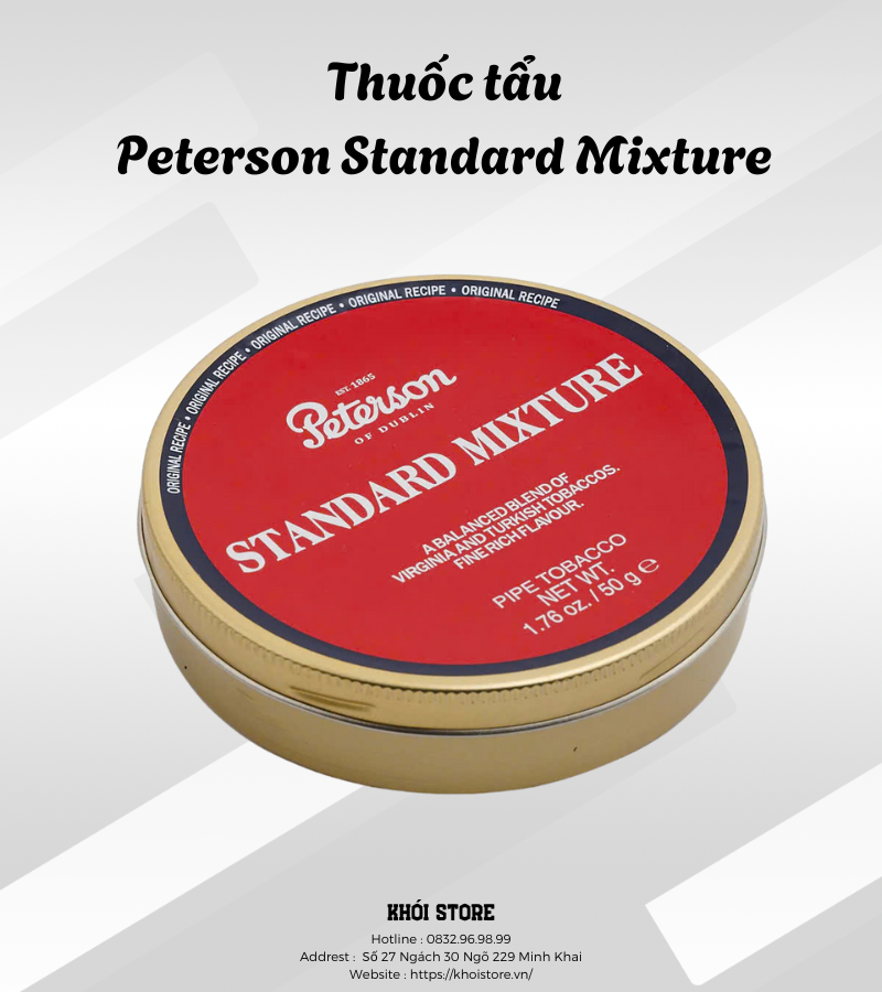 Thuốc tẩu Peterson Standard Mixture hiện có sẵn dạng hộp thiếc tròn với trọng lượng chuẩn 50g – tiện lợi, chắc chắn và bảo quản tốt hương thơm.