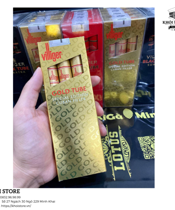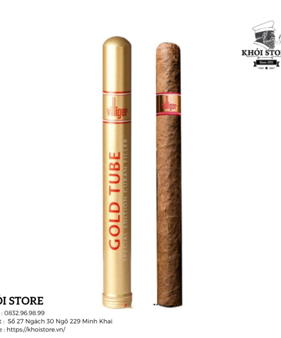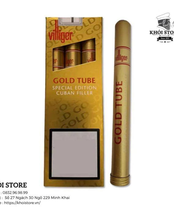 Xì gà Villiger Gold Tube Special Edition là dòng bán chạy nhất trong tất cả series Color Tube của Villiger, với lá xì gà là từ những cây giống đến từ Cuba và được trồng tại Dominican, phần lá wrapper mang màu nâu sẫm sử dụng lá của Brazil quấn chắc chắn và tạo cho xì gà vẻ bề ngoài bắt mắt. Với hương vị như da thuộc, hoa khô, chút cacao, cafe và cuối cùng là hương đất của xứ Dominican. Xì gà Villiger Gold Tube Special Edition là dòng xì gà đặc biệt của hãng Villiger, xuất xứ từ Switzerland. Với kích thước dài 165mm và đường kính vòng ring là 41, sản phẩm mang hình dáng tiêu chuẩn Corona. Điếu xì gà này không chỉ nổi bật về ngoại hình mà còn chinh phục người thưởng thức bởi hương vị đậm đà và tinh tế