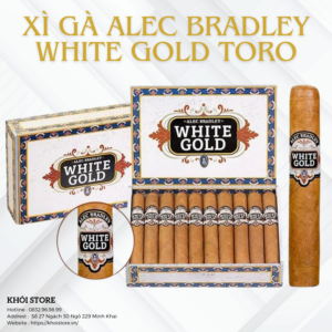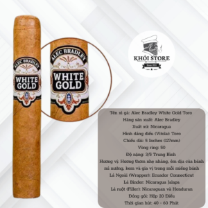 Cigar Alec Bradley White Gold Toro là dòng xì gà short-filler với hương vị nhẹ nhàng của bánh mì nướng, kem và gia vị. Điếu với kích thước dài 12.7cm và vòng ring 50 to. Được phát hành bởi Alec Bradley, thương hiệu nổi tiếng với nhiều xếp hạng hơn 90 điểm, cùng một số danh hiệu Xì gà hàng đầu của năm.