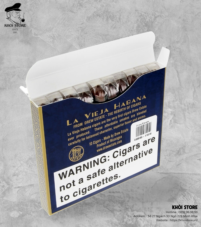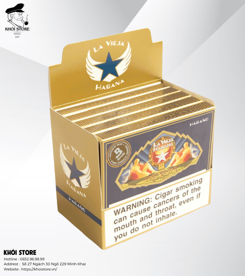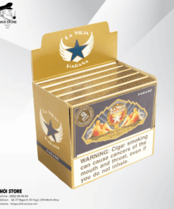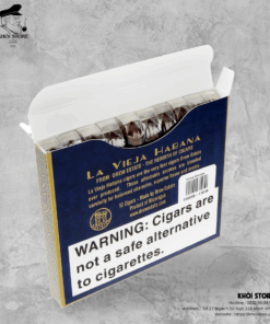 Sản phẩm được đóng gói trong hộp giấy màu xanh dương – vàng, in logo La Vieja Habana nổi bật và cảnh báo sức khỏe rõ ràng. Phần nắp có dán tem niêm phong và thông tin nhà sản xuất, thể hiện rõ sự chính thống và chuyên nghiệp.