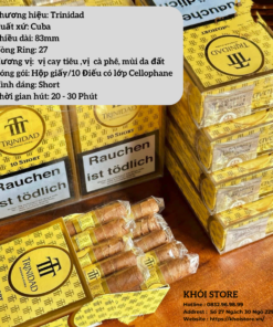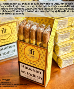 Xì Gà Trinidad Short là dòng xì gà với kích thước nhỏ gọn đến từ hãng Trinidad (một hãng xì gà hảo hạng nhất của Cuba và thường hay được so sánh với Cohiba – Xì gà Trinidad từ ngày xưa chỉ được sản xuất dành riêng cho các quan chức cấp cao của Cuba và đem biếu tặng ngoại giao). Xì gà Cuba Mini Trinidad Short nhanh chóng được nhều người yêu thích bởi nó vẫn mang hương vị đậm đà và mộc mạc của một điếu xì gà cao cấp và thời gian hút nhanh hơn chỉ tầm 20 phút sẽ hết 1 điếu.