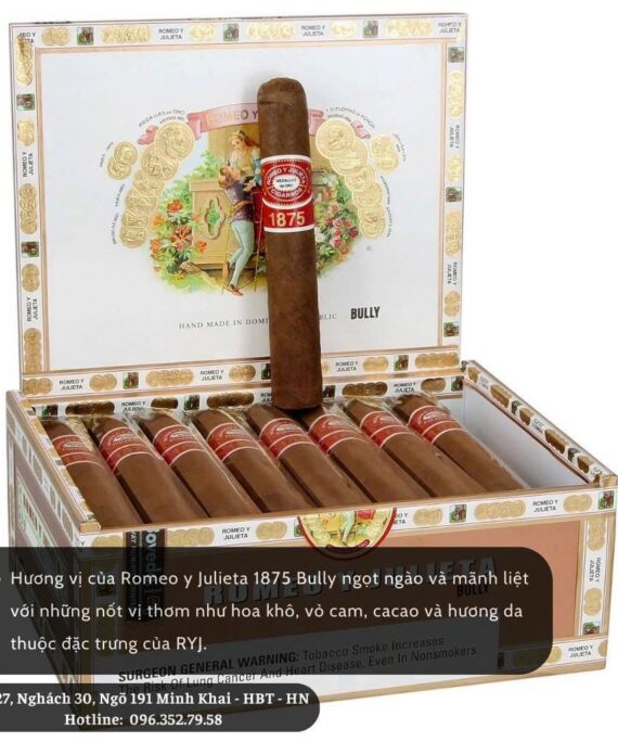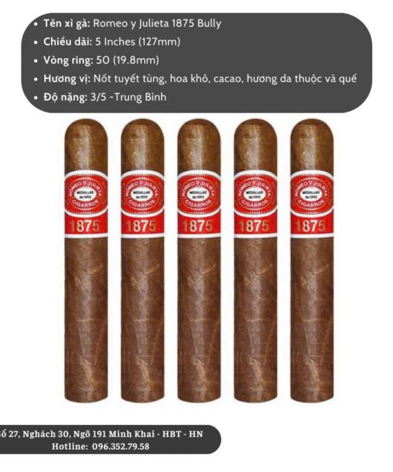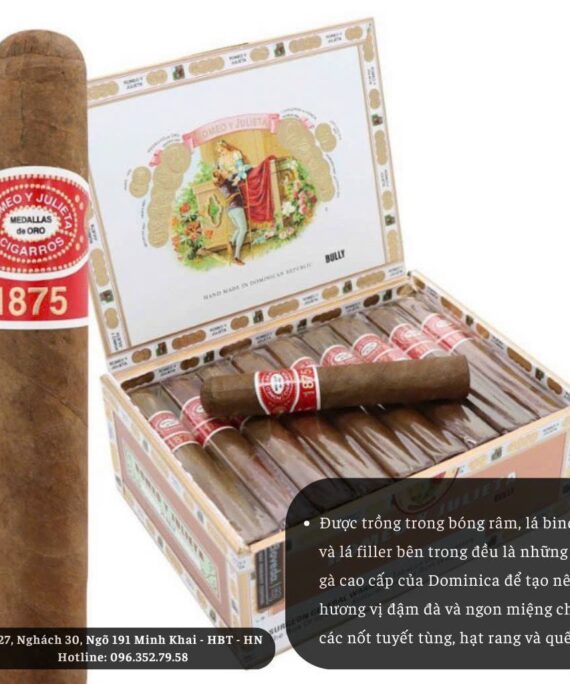 Xì gà Romeo y Julieta 1875 Bully là một sản phẩm nổi bật trong dòng xì gà Romeo y Julieta, một thương hiệu danh tiếng đến từ Cuba. Được ra mắt lần đầu tiên vào năm 1875, Romeo y Julieta đã xây dựng được một uy tín vững chắc trong ngành công nghiệp xì gà nhờ vào chất lượng hảo hạng và sự tinh tế trong từng sản phẩm.