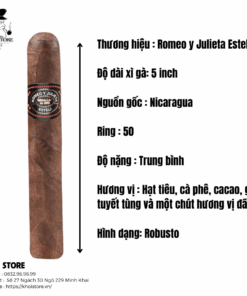 Một điếu Romeo y Julieta Esteli Robusto kéo dài khoảng 45 – 60 phút, vừa đủ cho một buổi chiều tĩnh lặng, một ly cà phê đen hoặc ly whisky mượt mà.
