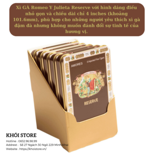 Xì Gà Romeo Y Julieta Reserve Amores – Xì Gà Chính Hãng với hình dáng điếu nhỏ gọn Amores (Small Panatela) và chiều dài chỉ 4 inches (khoảng 101.6mm) x ring 33, phù hợp cho những người yêu thích xì gà đậm đà nhưng không muốn đánh đổi sự tinh tế của hương vị.