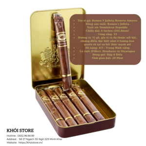 Nếu bạn là người yêu thích xì gà đậm đà và đang tìm kiếm một trải nghiệm độc đáo, đừng ngần ngại thử ngay Romeo Y Julieta Reserve Amores. Dòng xì gà này không chỉ mạnh mẽ mà còn đầy đủ hương vị, là lựa chọn hoàn hảo để thư giãn sau bữa tối hoặc trong các dịp đặc biệt.