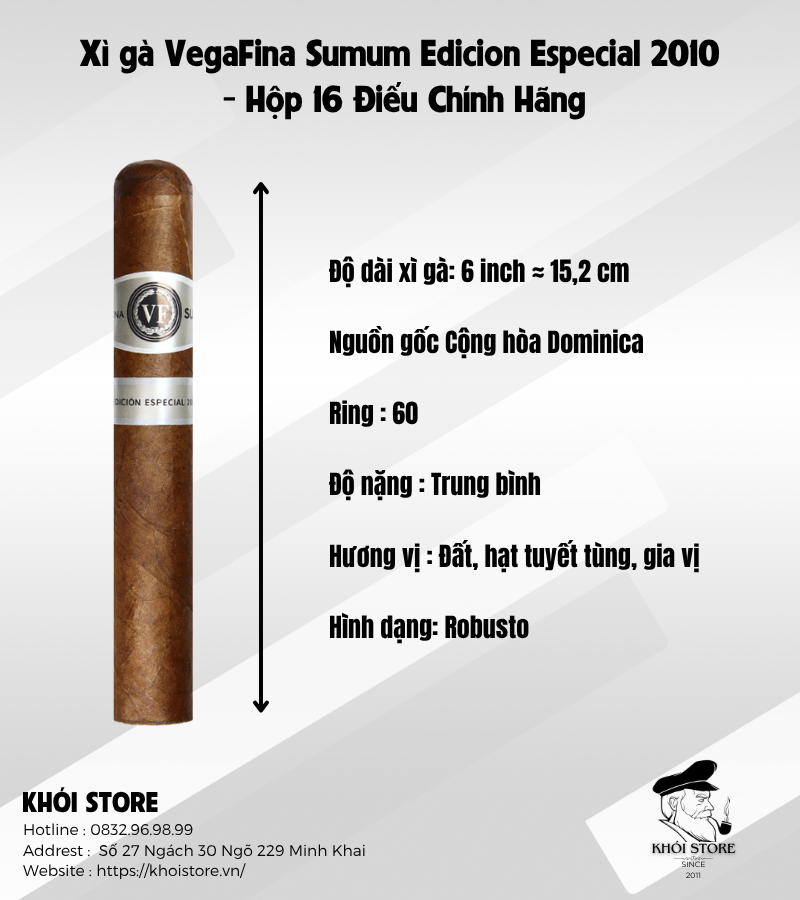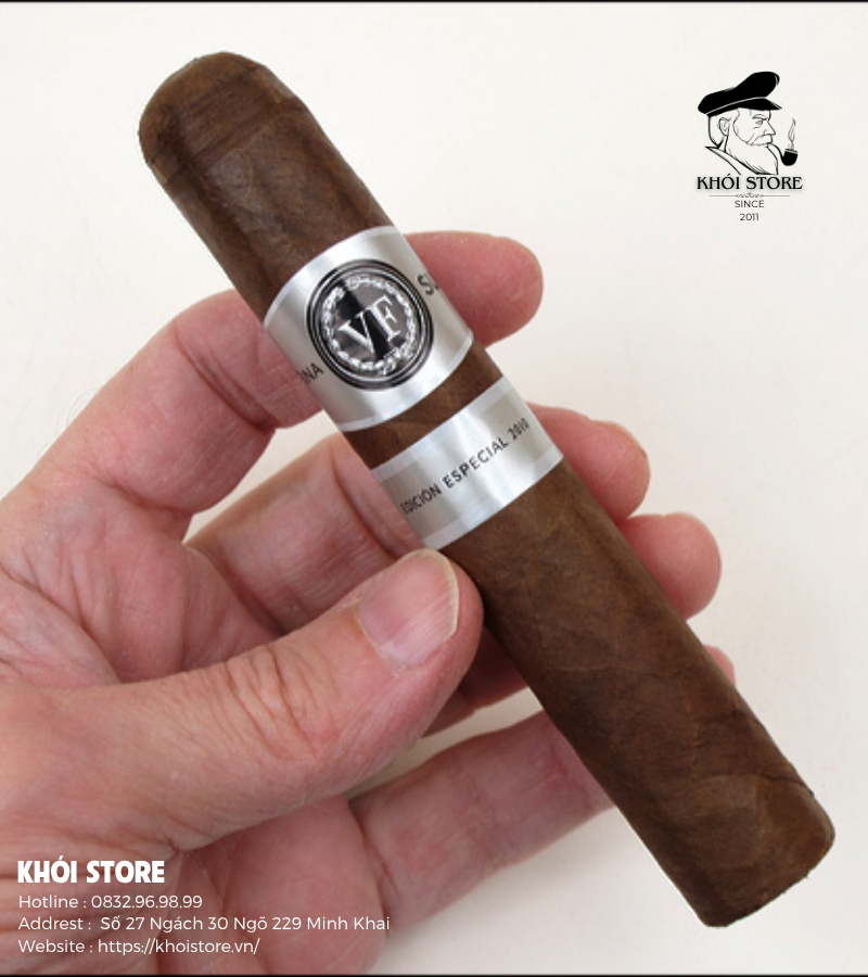 Hộp Xì gà VegaFina Sumum Edicion Especial 2010 được thiết kế bằng gỗ cao cấp với tông màu xám bạc trang nhã, toát lên vẻ hiện đại và tinh tế. Mỗi hộp gồm 16 điếu xì gà được sắp xếp gọn gàng, tạo cảm giác cao cấp ngay khi mở nắp.Điếu xì gà mang sắc nâu tự nhiên đặc trưng của lá wrapper, được bọc hoàn hảo, mượt mà, thể hiện tay nghề tỉ mỉ của các nghệ nhân Dominica. Vòng nhẫn bạc in nổi logo VF cùng dòng chữ “Edición Especial 2010” tạo nên điểm nhấn thanh lịch, thể hiện sự độc quyền và cao cấp của dòng sản phẩm này.
